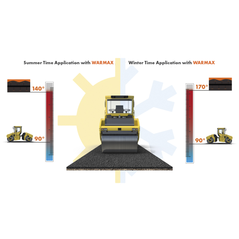 WARMAX is a liquid additive used during asphalt production to reduce the viscosity of asphalt mixtures, thereby facilitating application during winter or extending the paving distance during summer by maintaining lower temperatures of the hot mix asphalt during production and compaction. You no longer have to work in smoke! Due to the lower temperature of the hot mix asphalt during production and compaction, WARMAX significantly reduces aerosol and smoke emissions compared to conventional asphalt. It is a product that reduces environmental damage substantially through low odor and gas emissions in urban use, thereby preserving the health and safety of workers.